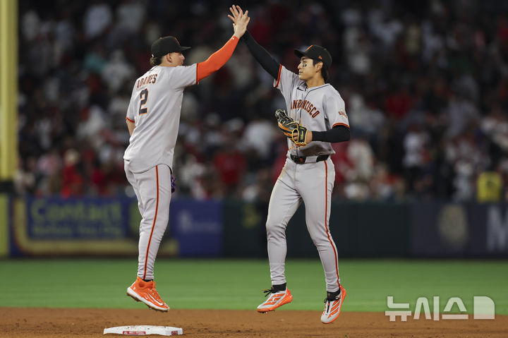 [애너하임=AP/뉴시스] 샌프란시스코 자이언츠의 이정후(오른쪽)가 19일(현지 시간) 미 캘리포니아주 애너하임의 에인절스타디움에서 열린 2025 메이저리그 로스앤젤레스 에인절스와 경기를 승리로 마친 후 유격수 윌리 아다메스와 자축하고 있다. 이정후는 4타수 1안타를 기록해 5경기 연속 안타를 이어갔고 샌프란시스코는 3-2로 승리했다. 2025.04.20. |