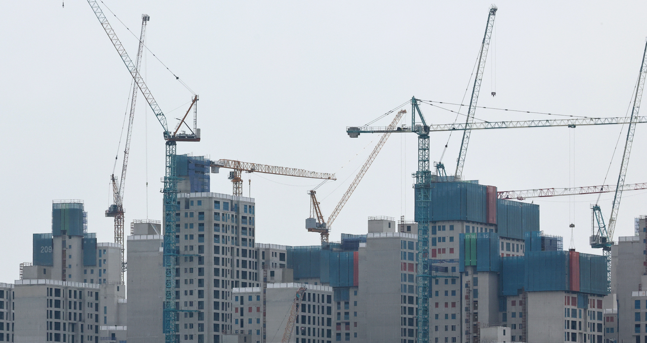 서울 시내 한 아파트 공사 현장에 타워크레인이 설치돼있다. [뉴시스] |