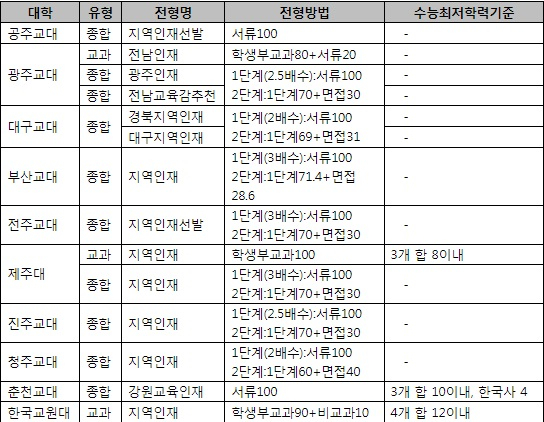 서울교대, 경인교대, 이화여대를 제외한 10개 대학은 지역인재전형을 운영한다. 지역인재전형은 해당 지역 고등학교 졸업(예정)자 등 일정한 자격을 갖춘 경우에만 지원 가능하므로 반드시 대학별 요강을 통해 지원 자격을 사전에 확인해야 한다.