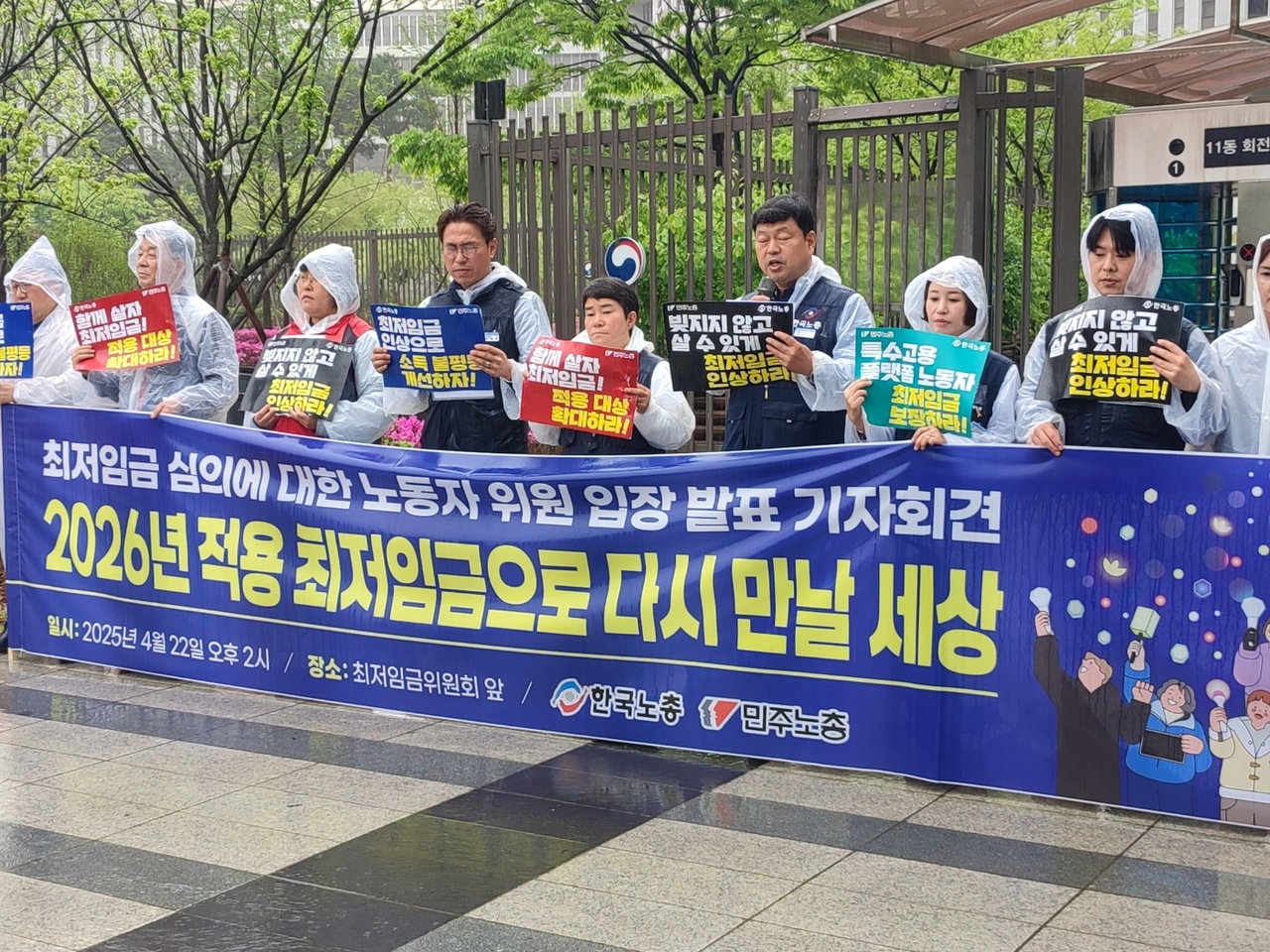 최저임금위원회 근로자위원들이 22일 2026년도 최저임금 심의를 위한 제1차 전원회의 개최에 앞서 정부세종청사 11동 앞에서 기자회견을 하고 있다. [한국노총 제공] |