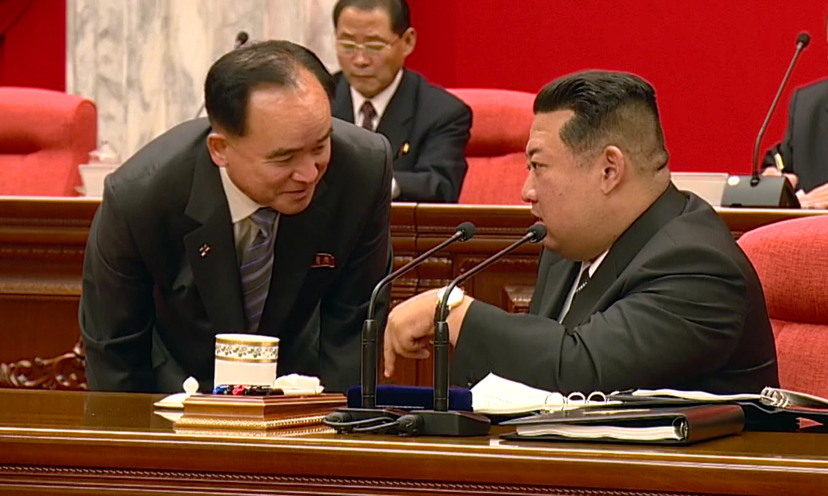 북한 조선노동장 중앙위원회 전원회의에서 김정은 북한 국무위원장(오른쪽)이 조용원 노동당 조직비서와 대화하고 있다. 뉴시스, 조선중앙TV 캡처 |