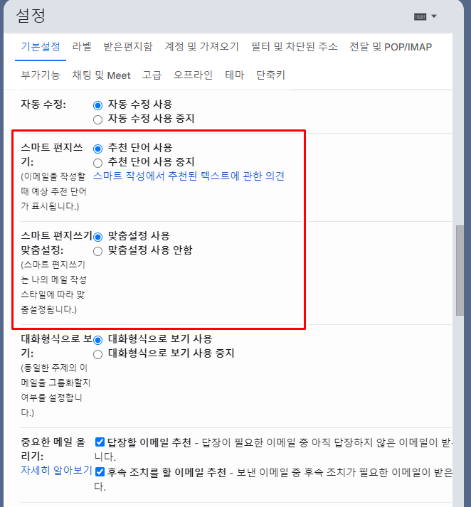 스마트 기능 및 개인 설정을 해제하지 않은 경우, 스마트 컴포지션은 기본적으로 켜져 있다. 그러나 설정 > 모든 설정 보기로 이동한 다음 기본 설정 탭 하단에서 스마트 편지쓰기를 찾아보자.