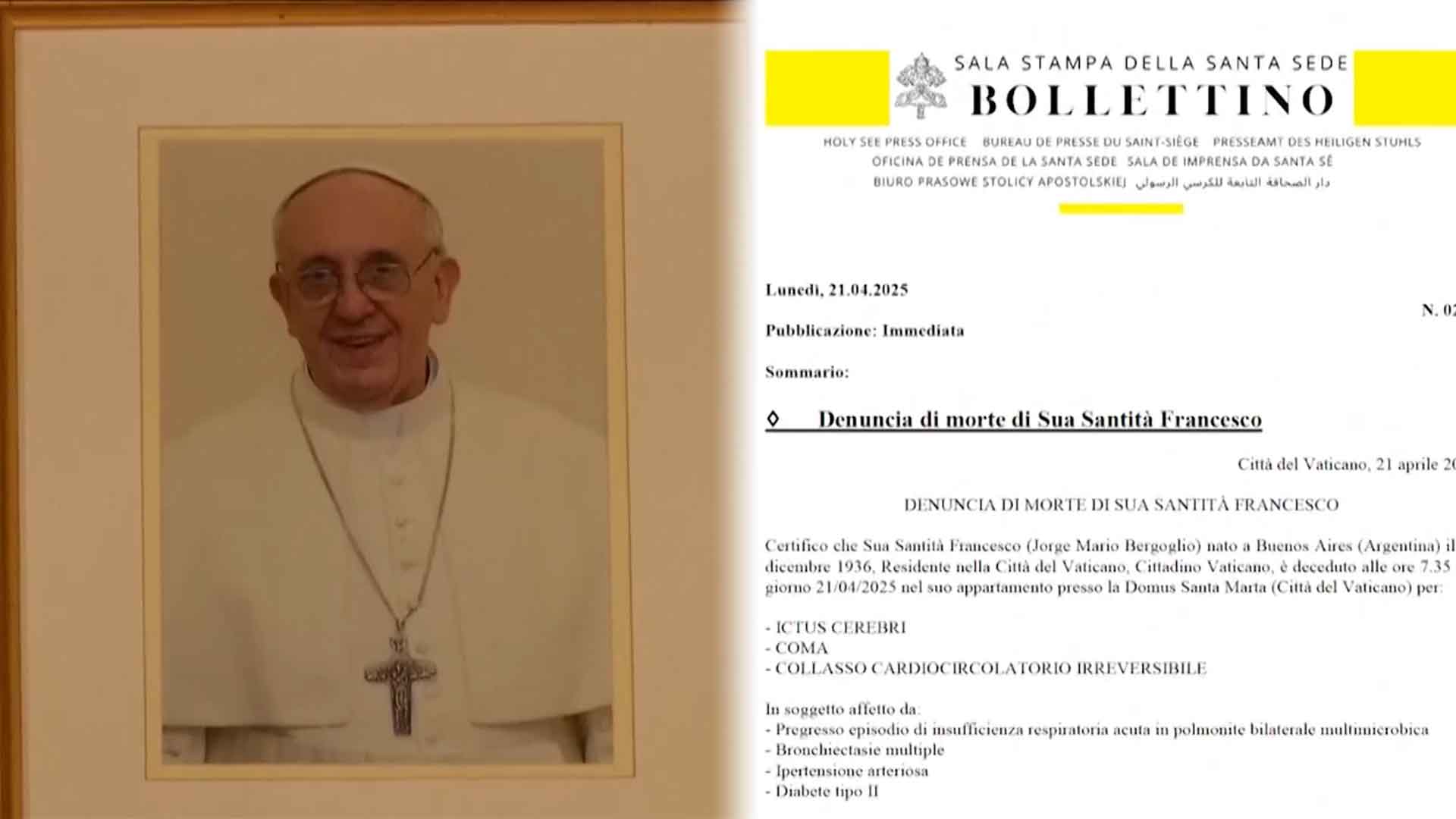 교황청은 프란치스코 교황이 뇌졸중으로 혼수 상태에 빠졌고, 회복 불가능한 심부전으로 사망했다고 공식 발표했습니다.