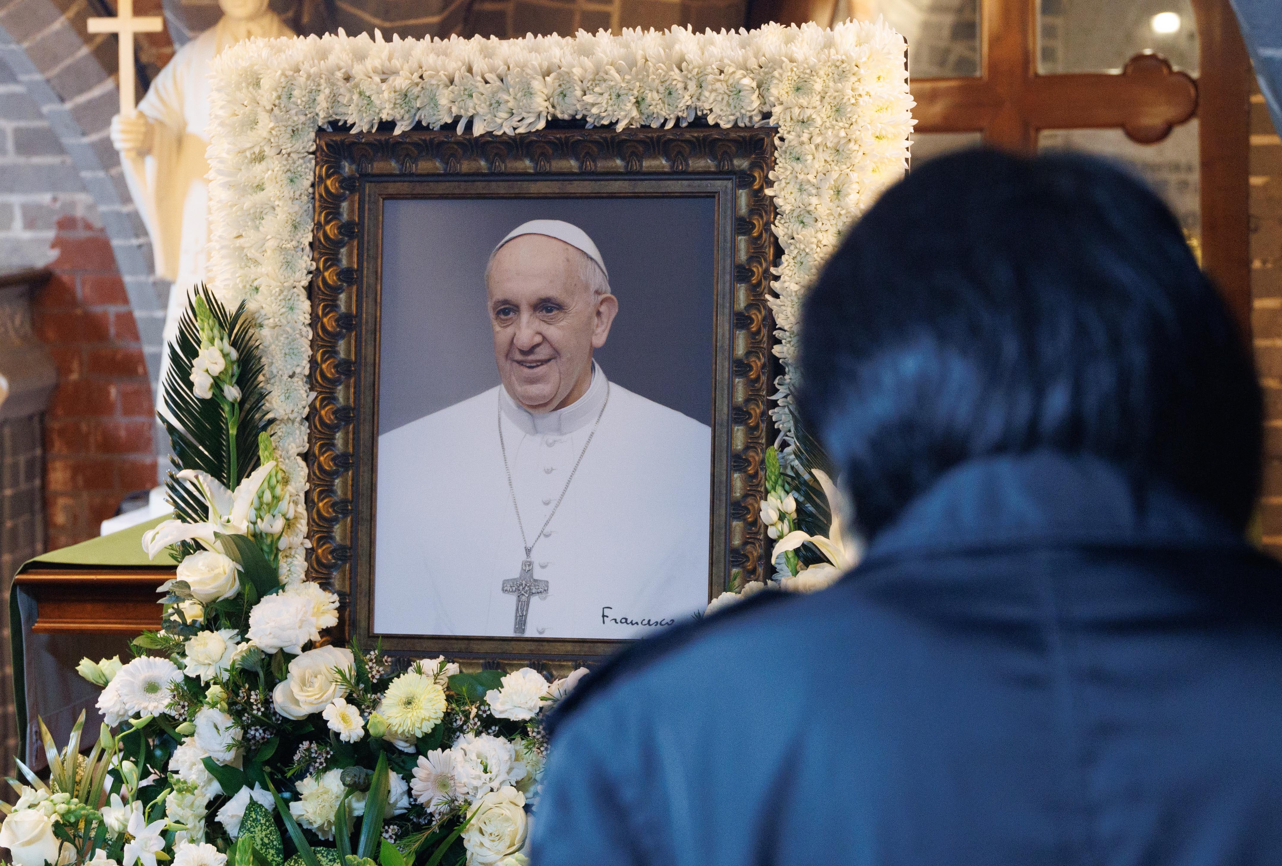 22일 오후 프란치스코 교황의 빈소가 마련된 서울 중구 명동대성당 지하성당에서 조문객들이 추모를 하고 있다. /사진공동취재단 |