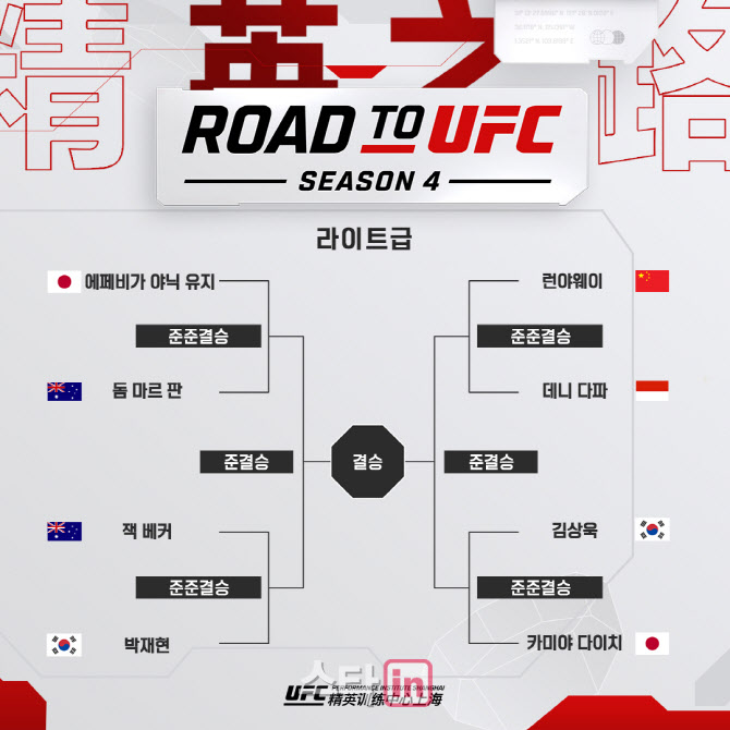 UFC는 오는 5월 22일과 23일(이하 한국시간) 양일에 걸쳐 중국 UFC 퍼포먼스 인스티튜트 상하이에서 ROAD TO UFC(로드 투 UFC) 시즌 4 오프닝 라운드를 개최한다. 로드 투 UFC는 아시아-태평양 지역의 정상급 MMA 유망주들에게 UFC 계약 기회를 제공하는 토너먼트다.