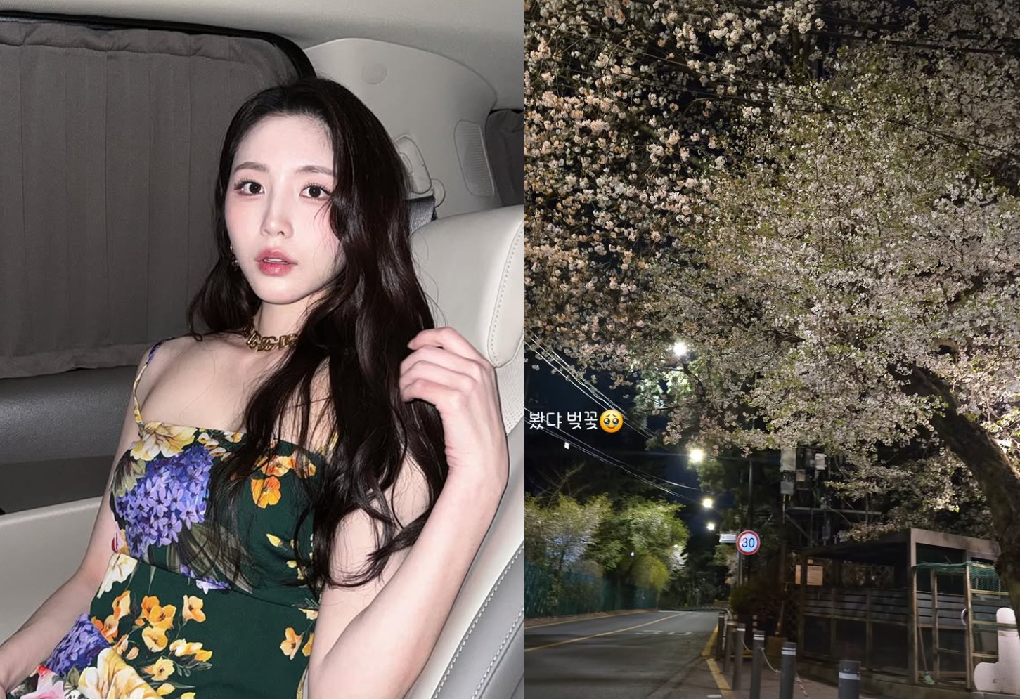 공개된 사진에는 늦은 밤이라 한적한 거리에서 벚꽃이 만개한 모습이 담겨있다. 특히 이번 게시물은 누군가가 찍어준 사진이 아닌 벚꽃 풍경만 담긴 사진이라는 점에서 눈길을 끌었다.