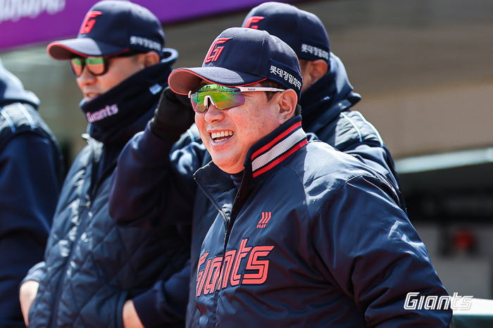롯데 김태형 감독이 사직구장에서 열린 2025 KBO리그 KT전에서 웃음을 보이고 있다. 사진 | 롯데 자이언츠 |