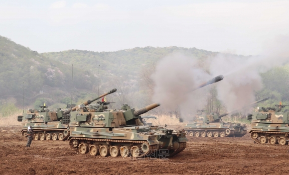 육군 1군단은 21일, 경기도 파주에서 포탄 사격훈련을 실시했다. 이번 훈련은 ‘9.19 군사합의’로 사격이 중단되었던 美스토리사격장 표적지에 7년만에 재개된 사격이다. 사진은 1포병여단 K9A1자주포가 포탄을 발사하고 있는 모습이다. 2025.4.22 (육군 제공) |