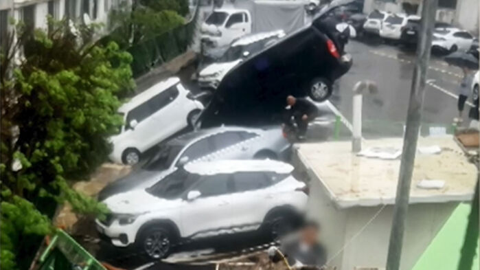 지상 주차장 일부가 무너져 내리고, 주차돼 있던 차량 여러 대가 그 사이에 빠져 있습니다.