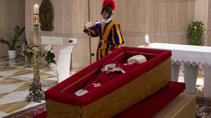 프란치스코 교황이 붉은 예복을 입고 두 손에 묵주를 든 채 관에 안치됐습니다.