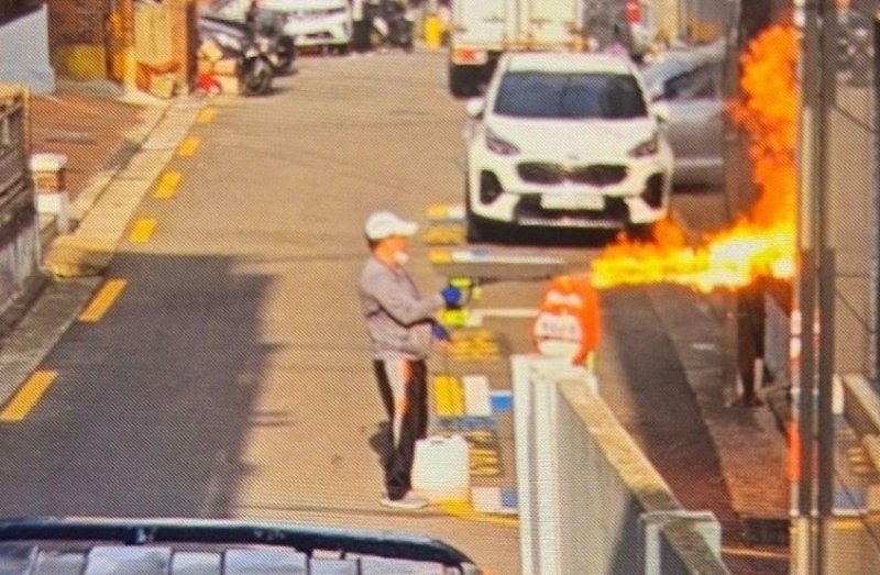 21일 오전 서울 관악구 봉천동에서 60대 남성이 농약살포기를 이용해 건물을 향해 불꽃을 발사하고 있다. (온라인 커뮤니티 갈무리. 재판매 및 DB 금지) /사진=뉴스1 |