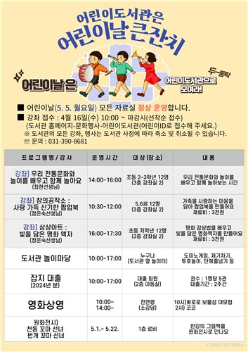 이 외에도 도서관 1층 로비에서는 노벨문학상을 받은 작가 한강의 그림책 '천둥 꼬마 선녀 번개 꼬마 선녀' 전시가 진행되며, 어린이날을 축하하는 포토존을 운영할 예정이다. 3층 소극장에서는 오전 10시와 오후 2시에 어린이도서관 상영작 중 인기 있었던 영화를 상영해 풍성한 볼거리를 제공할 예정이다.