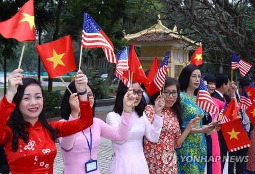 미국과 베트남 국기를 들고 있는 하노이 시민들 |