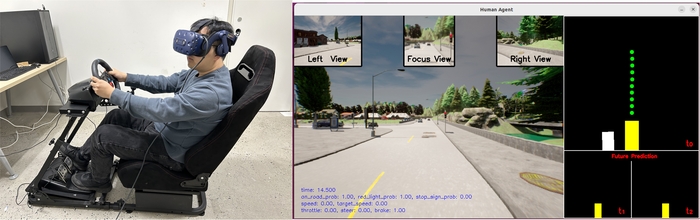 카를라(CARLA) 시뮬레이터와 가상현실(VR)을 통한 시뮬레이션 기반의 엣지-클라우드 자율주행 시연 모습.(카이스트 빅데이터 엣지 클라우드 서비스 연구센터 제공) |
