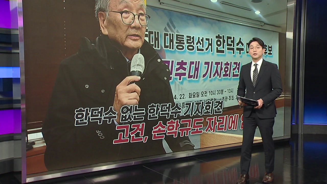 현수막에는 '대통령 선거 한덕수', '기자회견'이라는 문구가 보이고요.