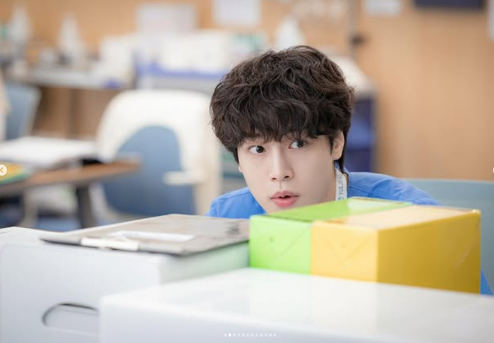 특히, 병원 복도를 배경으로 양손을 들어 보이며 익살스러운 표정을 짓거나, 사무실 책상 뒤에 숨어 놀란 듯한 모습을 보여주는 등 신입 전공의 엄재일 역의 허당미와 풋풋함이 돋보인다.