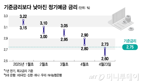 실제 정기예금 금리 산정의 기준이 되는 은행채(1년물·AAA) 금리는 지난 21일 2.596%를 기록하며 2022년 5월27일 이후 약 3년 만에 2.5%대로 복귀했다. 지난 3개월(1~3월) 동안 3.8%대를 유지하던 게 이달 들어서만 0.2%P(포인트) 넘게 떨어진 것이다.