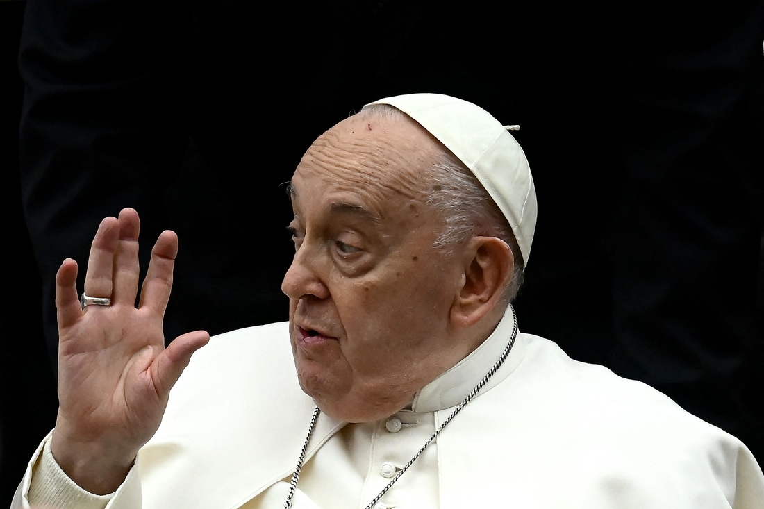 프란치스코 교황이 바티칸의 어린이 병원 창립 100주년 기념식에서 청중을 향해 손을 흔들고 있다. 2024년 3월 16일 촬영/AFP연합뉴스 |