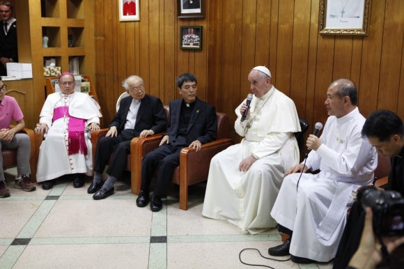 프란치스코 교황이 2014년 8월 15일 서울 마포구 예수회 서강대 공동체를 깜짝 방문해 예수회원들에게 훈화하고 있다. 예수회 한국관구 제공 |