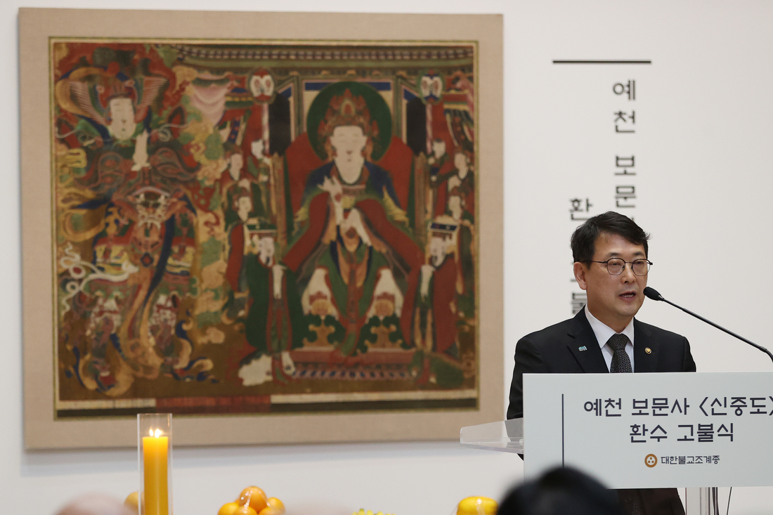 최응천 국가유산청장이 23일 서울 종로구 한국불교역사문화기념관에서 열린 예천 보문사 신중도 환수고불식에서 인사말을 하고 있다. 연합뉴스 |