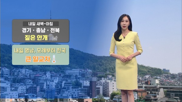 또, 내일 새벽부터 아침 사이, 경기남서부와 충남, 전북에는 안개가 매우 짙게 껴 교통안전에 주의하셔야겠고요.
