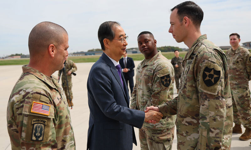 이어 미 2항공여단 헬기 격납고로 이동해 지난 3월 산불 진화작업에 참가한 장병들에게 감사의 뜻도 전했다. 이 자리에서 한 권한대행은 자신이 예비역 병장임을 강조하며 군번까지 언급했다. 그러면서 “한반도의 평화를 위해 헌신하는 장병들을 격려하기 위해 왔는데, 열정과 패기에 찬 늠름한 모습을 보니 오히려 더 큰 위로와 격려를 받게 된다”고 말했다. 한 권한대행은 윌 마셜 대위와 박성우 대위 등 산불 진화작업에 투입된 한·미 장병 6명의 이름을 일일이 언급하며 감사의 뜻을 전했다.