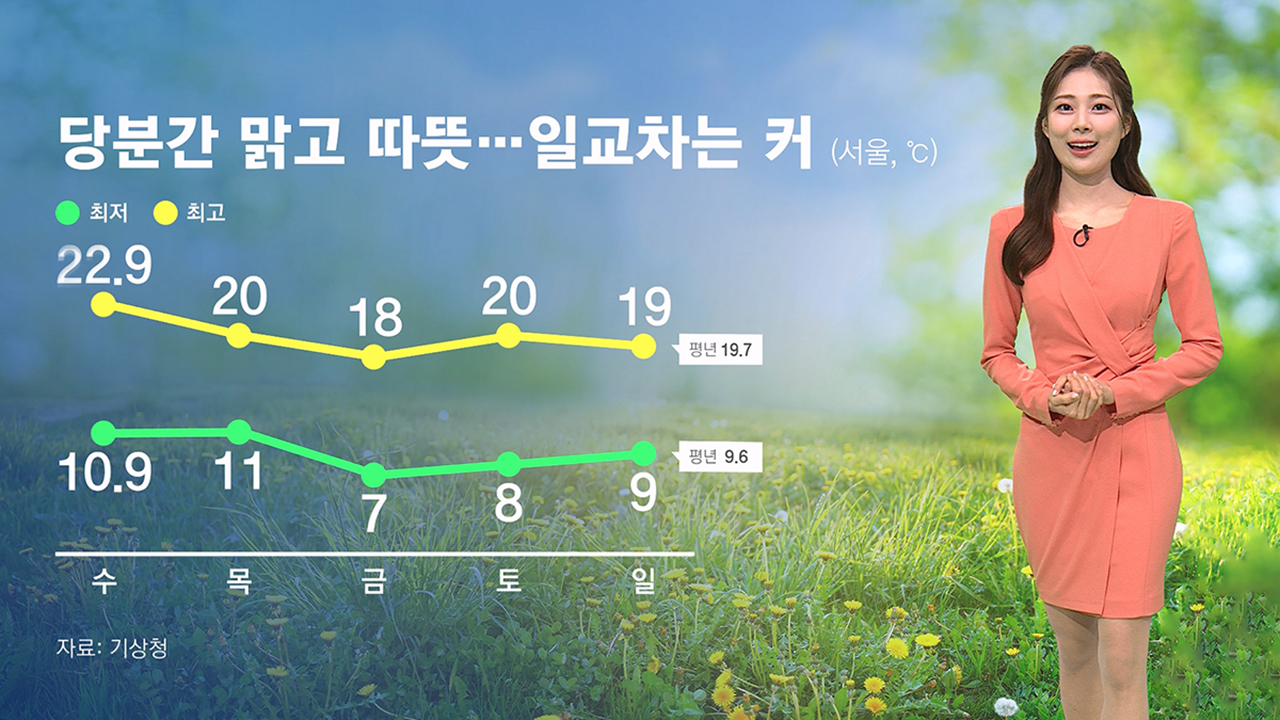 오늘(23일)은 야외 활동하기 더할나위 없이 좋은 날씨였습니다. 남은 한주 동안도 맑고 따스한 봄 날씨가 펼쳐지겠는데요. 다만, 낮에는 20도 안팎까지 올라도 아침저녁에는 10도를 밑돌며 쌀쌀하게 느껴지겠습니다. 큰 일교차를 고려해서 외투는 꼭 챙겨서 나오시기바랍니다.