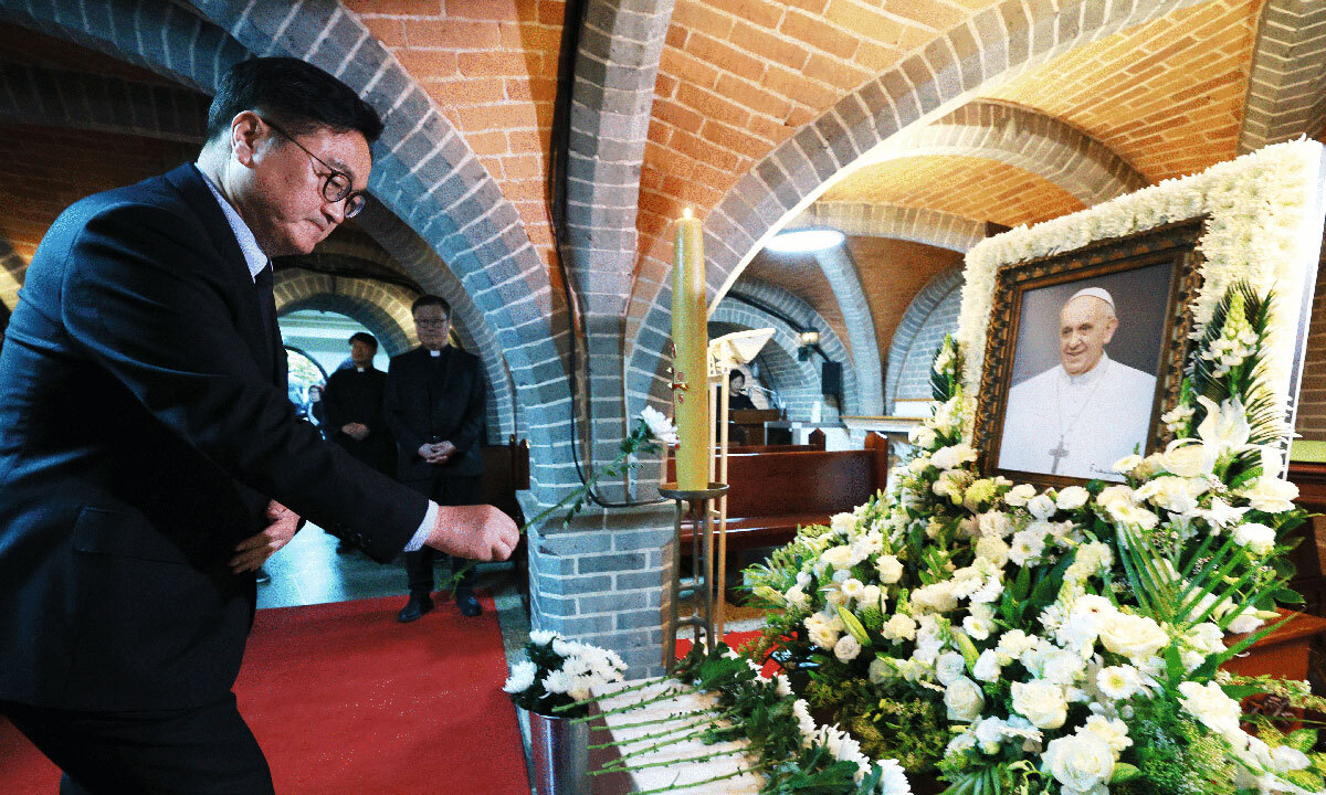 우 의장은 조문에 앞서 정순택 대주교를 만나 “교황께서는 세상에서 가장 낮은 곳에 계셨고, 누구보다 먼저 고통받는 이들을 품으셨다”며 “2014년 방한 당시 세월호 유가족 손을 잡고 ‘유족의 고통 앞에서 중립을 지킬 수 없었다’며 진심 어린 위로를 건네셨던 모습은 지금도 우리 국민들의 가슴에 남아 있다”고 말했다.