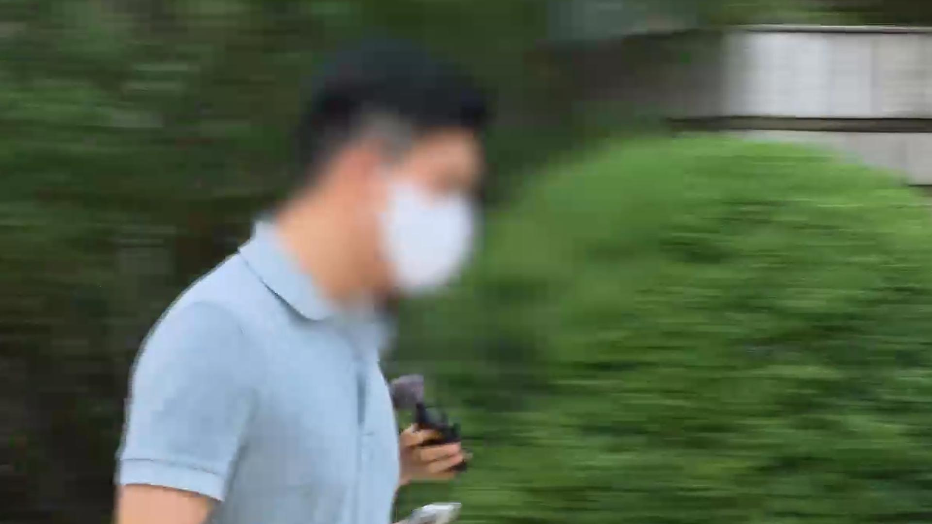 하늘색 반팔티에 흰색 마스크를 쓴 남성이 법원 입구에서 걸어나옵니다.