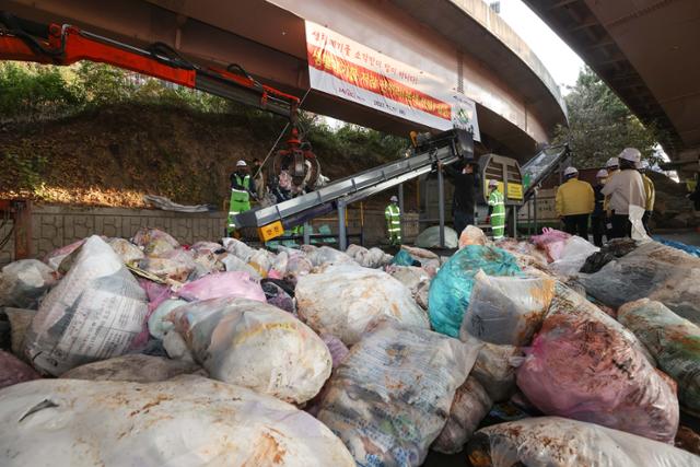 그러잖아도 심각했던 쓰레기 문제가 코로나19 이후 더욱 본격화하고 있습니다. 쓰레기 문제는 생태계 파괴뿐 아니라 주민 간, 지역 간, 나라 간 싸움을 일으키기도 합니다. '쓰레기 박사'의 눈으로 쓰레기 문제의 핵심과 해법을 짚어보려 합니다. '그건 쓰레기가 아니라고요' '지금 우리 곁의 쓰레기'의 저자 홍수열 자원순환사회경제연구소장이 <한국일보>에 4주 단위로 목요일 연재합니다.2022년 11월 17일 서울 마포구 청소차 차고지에서 생활쓰레기 전처리 실증이 이뤄지고 있다. 사진과 칼럼 내용은 직접적인 관련은 없음. 연합뉴스 |