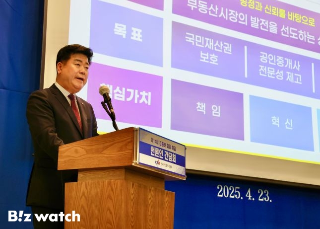 김종호 공인중개사협회장이 23일 서울 중구 한국프레스센터에서 신임 회장 취임 기자간담회를 열고 핵심 추진과제를 발표하고 있다./사진=공인중개사협회 |