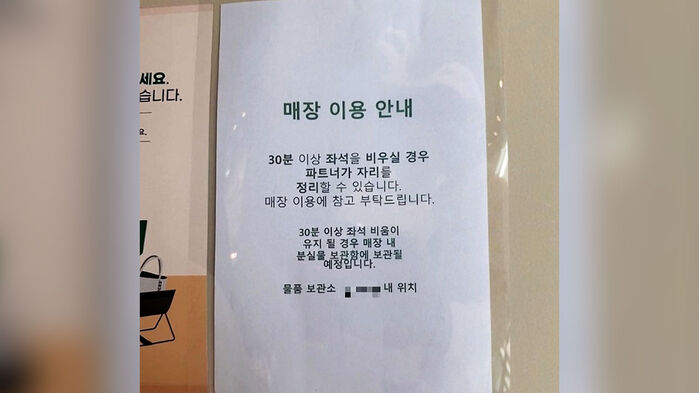 30분 이상 좌석을 비우면 직원이 자리를 정리할 수 있고, 물품은 매장 내 분실물 보관함에 보관된다고 적혀 있습니다.