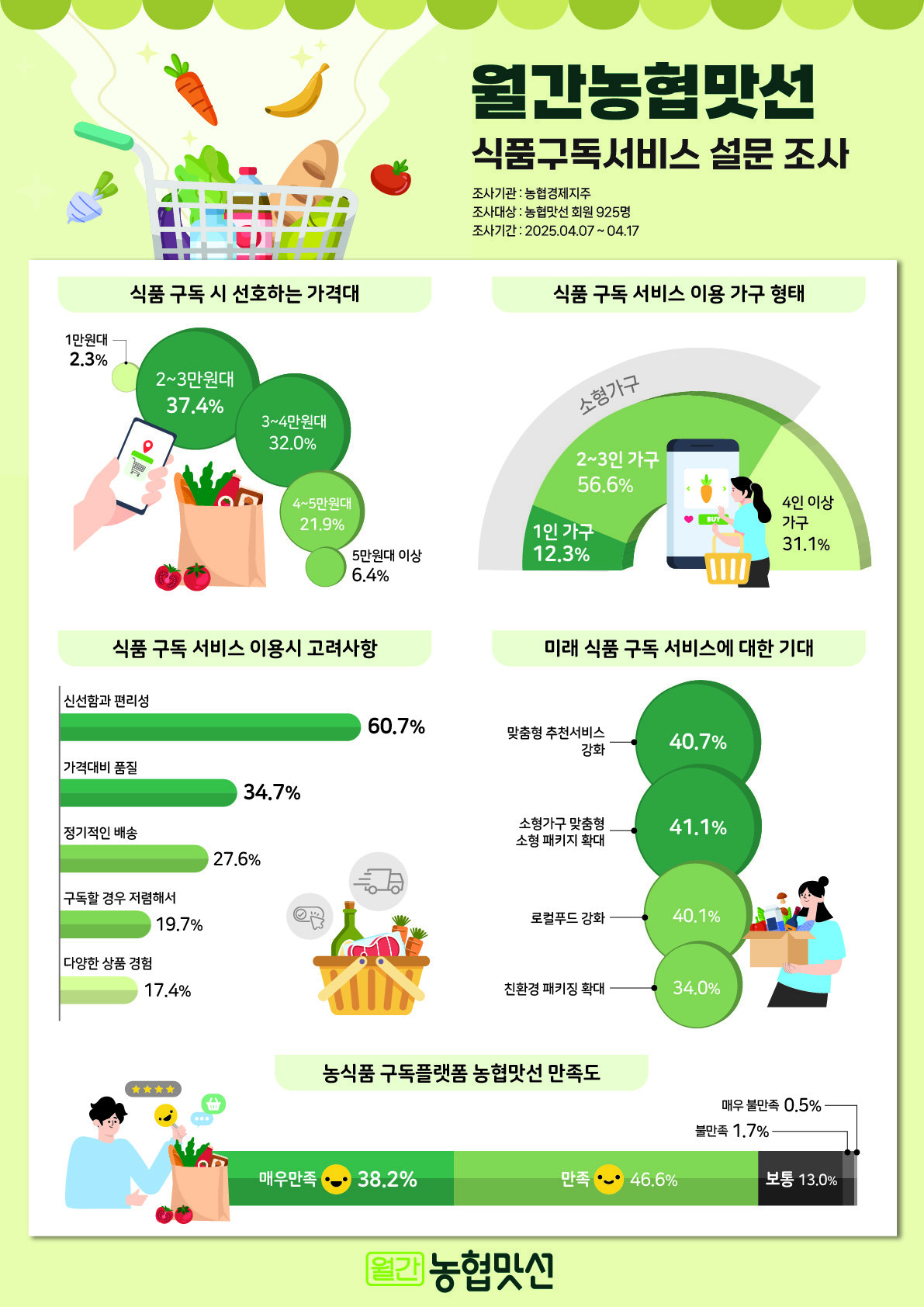 23일 월간농협맛선에 따르면 지난 4월 7일부터 17일까지 월간농협맛선 회원 920여 명을 대상으로 진행된 설문조사 결과 소비자들이 가장 적당하다고 생각하는 월 식품 구독료는 2~3만 원대(37.4%)다. 이어 3~4만 원대(32%), 4~5만 원대(21.9%) 순으로 나타났다.