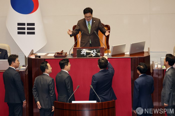 [서울=뉴스핌] 정일구 기자 = 권성동 국민의힘 원내대표가 24일 오전 서울 여의도 국회 본회의장에서 열린 제242회 국회(임시회) 제6차 본회의에서 우원식 국회의장의 발언에 항의하고 있다. 2025.04.24 mironj19@newspim.com