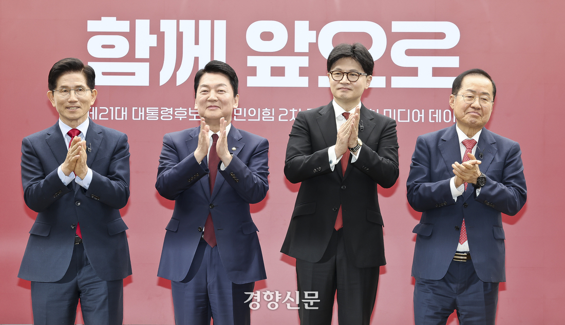 국민의힘 김문수(왼쪽부터), 안철수, 한동훈, 홍준표 대선 경선 후보가 지난 23일 서울 여의도 국민의힘 중앙당사에서 열린 2차 경선 토론회 미디어데이에서 박수를 치고 있다. 성동훈 기자 |
