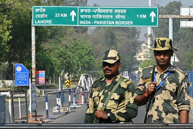 인도 국경경비대(BSF) 병사들이 24일(현지시간),인도-파키스탄 와가 국경 검문소 입구에서 경계를 서고 있다/AFP 연합뉴스 |