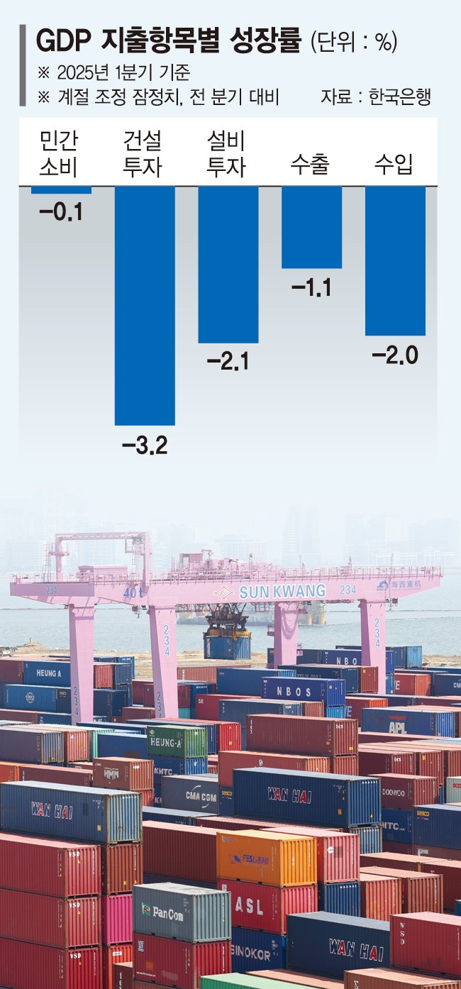 문제는 17개 분기 만에 뒷걸음질친 성장률에 도널드 트럼프 미국 대통령의 고강도 관세 압박 영향이 본격적으로 반영되지 않았다는 점이다. 실제 수출이 화학제품과 기계·장비를 중심으로 1.1% 감소했으나 3월까지는 알루미늄·철강을 제외하고 미국이 관세를 부과하기 전이다.