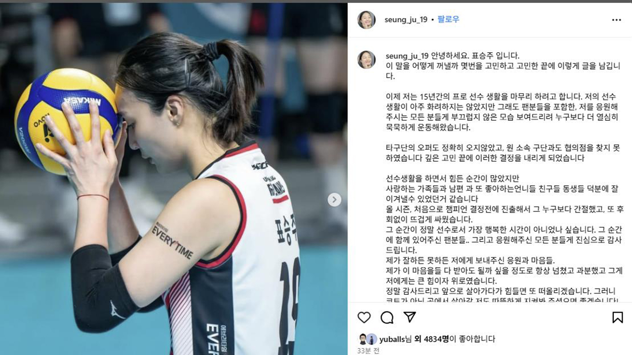 그는 이어 "선수 생활을 하면서 힘든 순간이 많았지만, 사랑하는 가족과 남편, 좋아하는 언니, 친구, 동생들 덕분에 잘 이겨낼 수 있었던 거 같다"면서 "응원해 주신 모든 분에게 진심으로 감사드린다"고 고마움을 표현했습니다.
