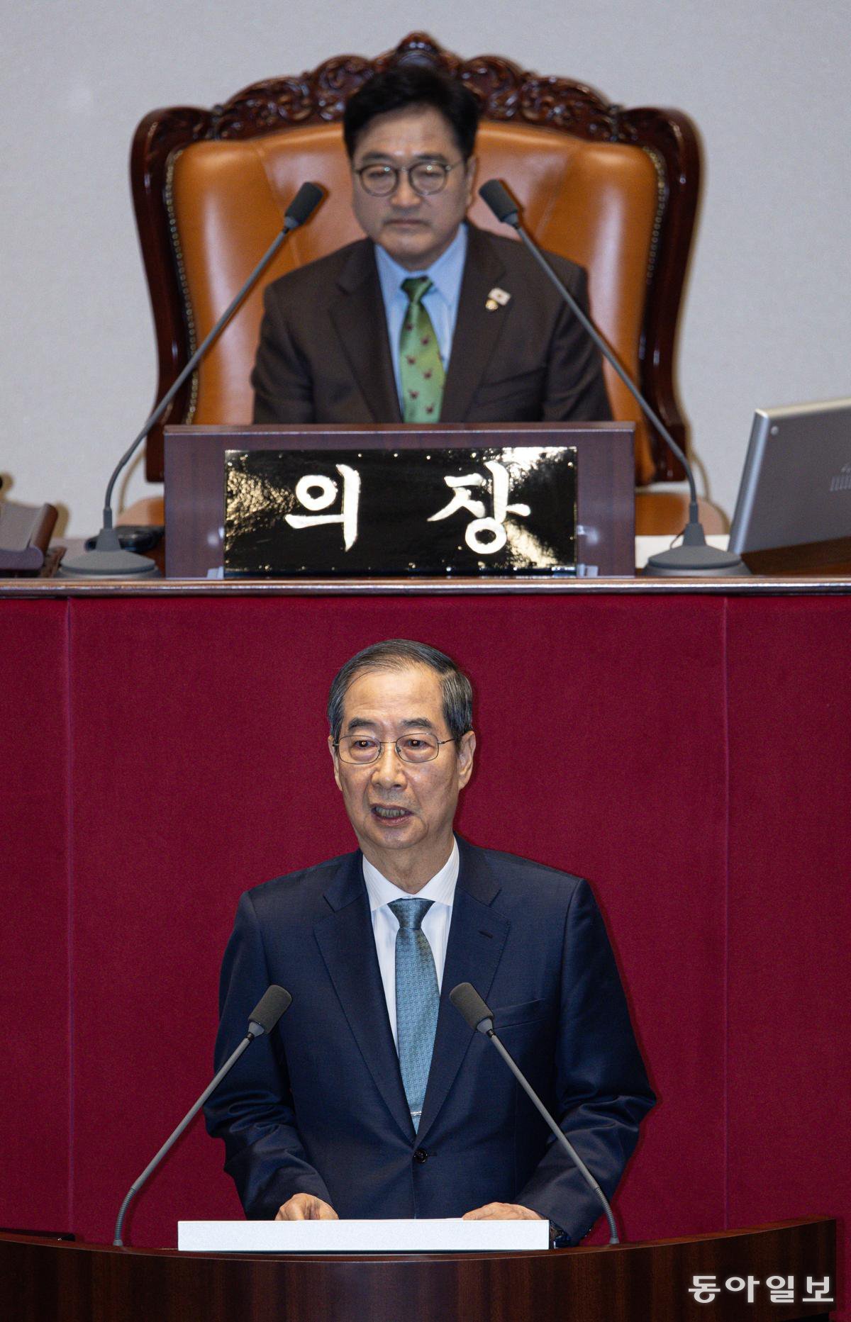 한덕수 대통령 권한대행 국무총리가 24일 오전 서울 여의도 국회 본회의장에서 열린 제424회 국회(임시회) 제6차 본회의에서 2025년도 제1회 추가경정예산안에 대한 정부의 시정연설을 하고 있다. 사진공동취재단 |