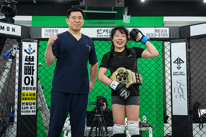 오정은이 초대 KMMA 여자 슈퍼스트로급 챔피언 등극 기념 촬영을 하고 있다. 왼쪽은 대회 메인스폰서 뽀빠이연합의원 김성배 대표원장. 사진=스탠다드앤드프로그레스 스포츠에이전시 제공 |
