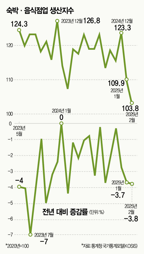 숙박·음식점업 생산지수는 지난해 1월만 제외하고 2023년 5월부터 지난 2월 사이 내내 감소했다. 지난해 1월도 전년 동월 대비 보합으로 제자리걸음에 그쳤을 뿐이다. 숙박·음식점업 생산이 22개월째 단 한 번도 늘지 못하면서 서비스업 생산지수가 집계되기 시작한 2000년 이후 ‘역대 최장 부진’을 기록했다.