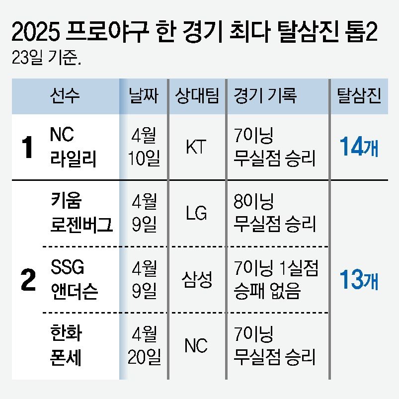 키움 로젠버그(30)와 SSG 앤더슨(31)도 이달 9일 나란히 13탈삼진 경기를 했다. 올 시즌 두 자릿수 탈삼진은 14차례 나왔는데 이 중 10번이 외국인 투수의 기록이다. 국내 투수 중에는 고영표(KT)가 2회, 소형준(KT)과 박세웅(롯데)이 1회씩 이름을 올렸다.