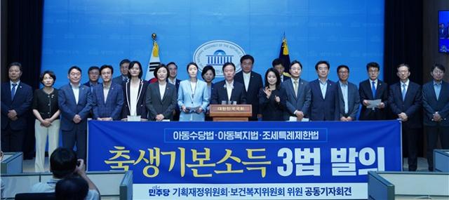 더불어민주당 기획재정위원회, 보건복지위원회 소속 의원들이 2024년 6월 17일 출생기본소득 3법 발의 기자회견을 하고 있다. 임광현 의원 페이스북 |