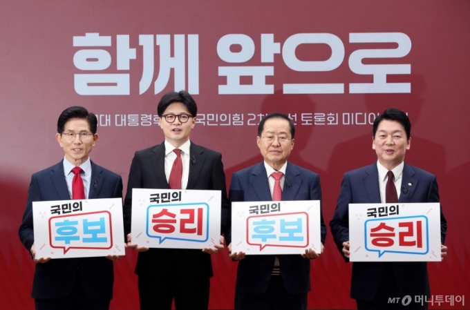 [서울=뉴시스] 국회사진기자단 = 김문수(왼쪽부터), 한동훈, 홍준표, 안철수 제21대 대통령 선거 국민의힘 경선 후보가 23일 서울 여의도 국민의힘 중앙당사에서 열린 2차 경선토론회 미디어데이에서 기념촬영을 하고 있다. 2025.04.23. photo@newsis.com /사진= |