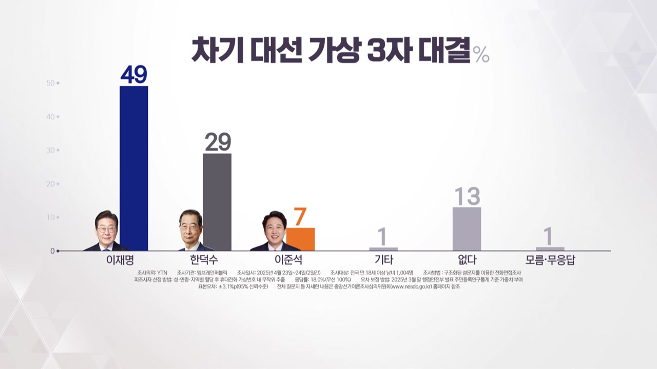 한덕수 권한대행이 출마했다고 가정했을 때, 이 후보는 49%, 한 대행 29%, 이준석 후보 7%로 나타났고,