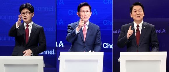 국민의힘 대선 2차 경선 ‘맞수 토론’ 첫날인 24일 ‘반탄’(탄핵 반대) 김문수 후보와 ‘찬탄’(탄핵 찬성) 한동훈·안철수 후보가 12·3 비상계엄과 윤석열 전 대통령 탄핵을 놓고 정면충돌했다. 김 후보는 한 후보와 안 후보에게 각각 탄핵 책임론을 제기했고, 한 후보와 안 후보는 김 후보를 향해 “국민 앞에 사과할 의향이 있느냐”며 공세를 펼쳤다.