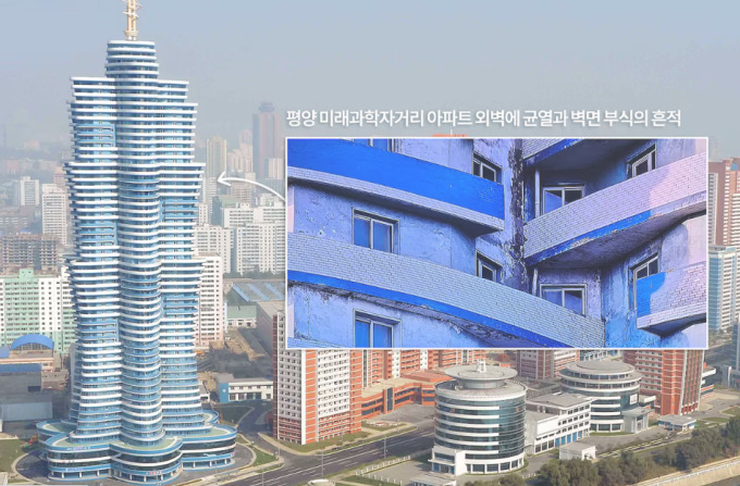 [서울=뉴스핌] 이영종 통일전문기자 = 김정은 주도로 핵과 미사일 개발 과학자들에게 선물하기 위해 2015년 평양 중심부에 지어진 53층 아파트가 붕괴 위기에 처했다고 미 자유아시아방송(RFA)이 25일 보도했다. 사진은 해당 아파트와 벽면의 균열과 부식 상태가 담긴 사진. [사진=RFA] 2025.04.25 yjlee@newspim.com |