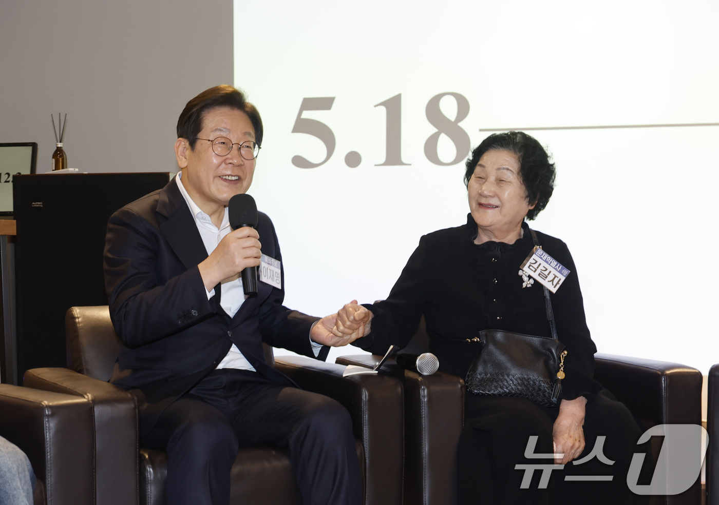이재명 더불어민주당 대선 경선 후보가 24일 광주 전일빌딩245에서 열린 민주주의 간담회에서 김길자 문재학열사 모친과 인사를 나누고 있다. 2025.4.24/뉴스1 ⓒ News1 김태성 기자 |