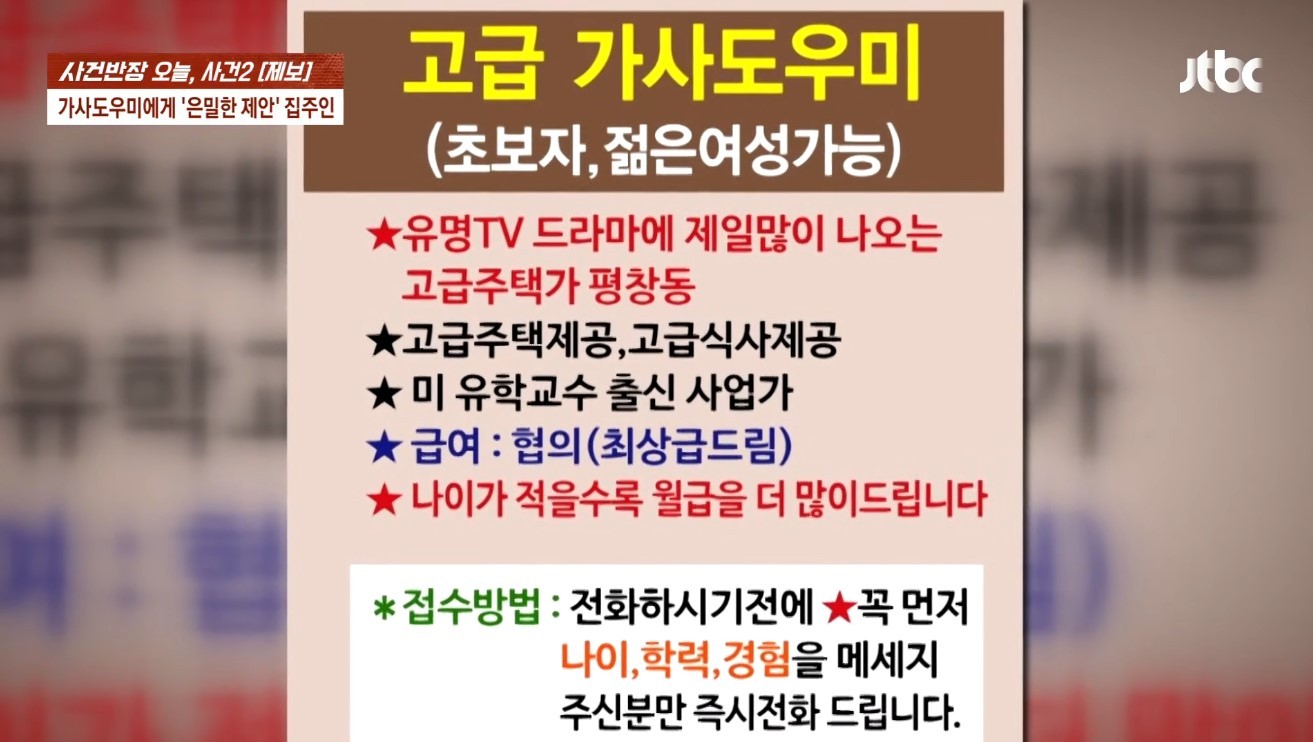 '고급 가사 도우미' 구인 글에는 △초보자, 젊은 여성 가능 △미 유학 교수 출신 사업가 △급여 최상급 드림 △나이가 적을수록 월급을 더 많이 드린다는 등 내용이 강조돼 있었다.
