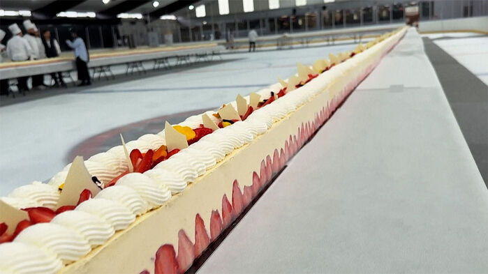 20여 명의 제과 금손들이 무려 일주일 동안 힘을 합쳐 무게 1.2t, 길이가 121m도 넘는 딸기 케이크를 완성했다고 하네요.
